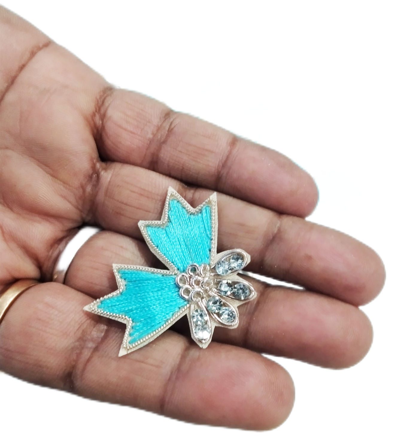 Introducing bloomun’s  butterfly design   blue  beautiful applique, an eye-catching accessory that is perfect for bringing a touch of glamour to any outfit. Featuring classic silver border and  crystal white stone accents, it adds the ideal finishing touch to your look. Crafted from durable materials with intricate details, this stylish accent will quickly become a staple in every wardrobe.
