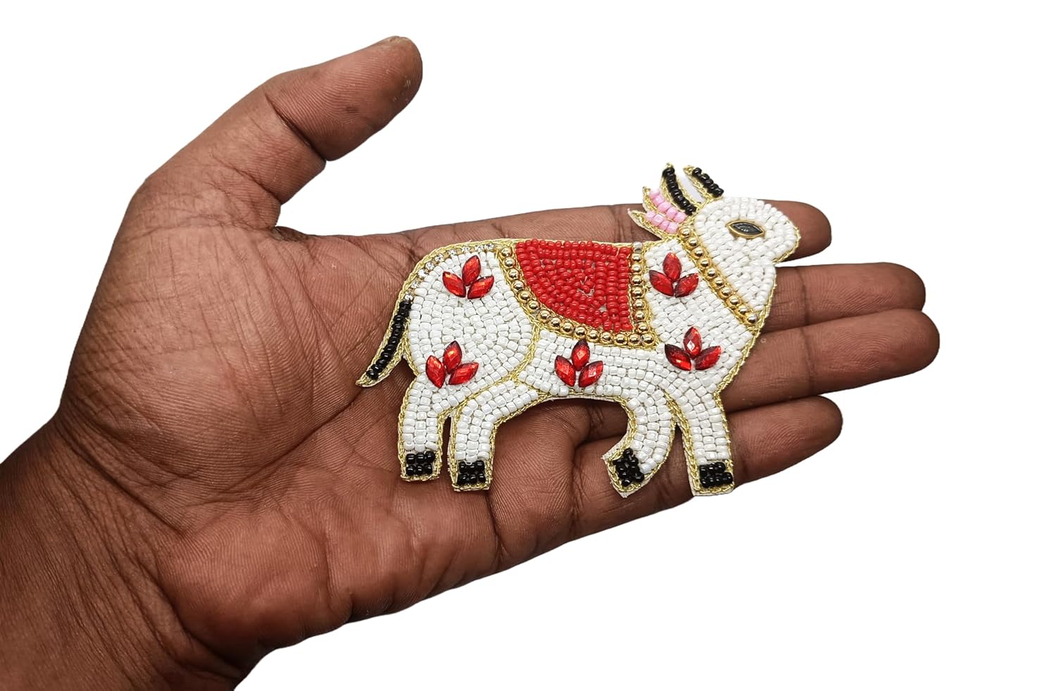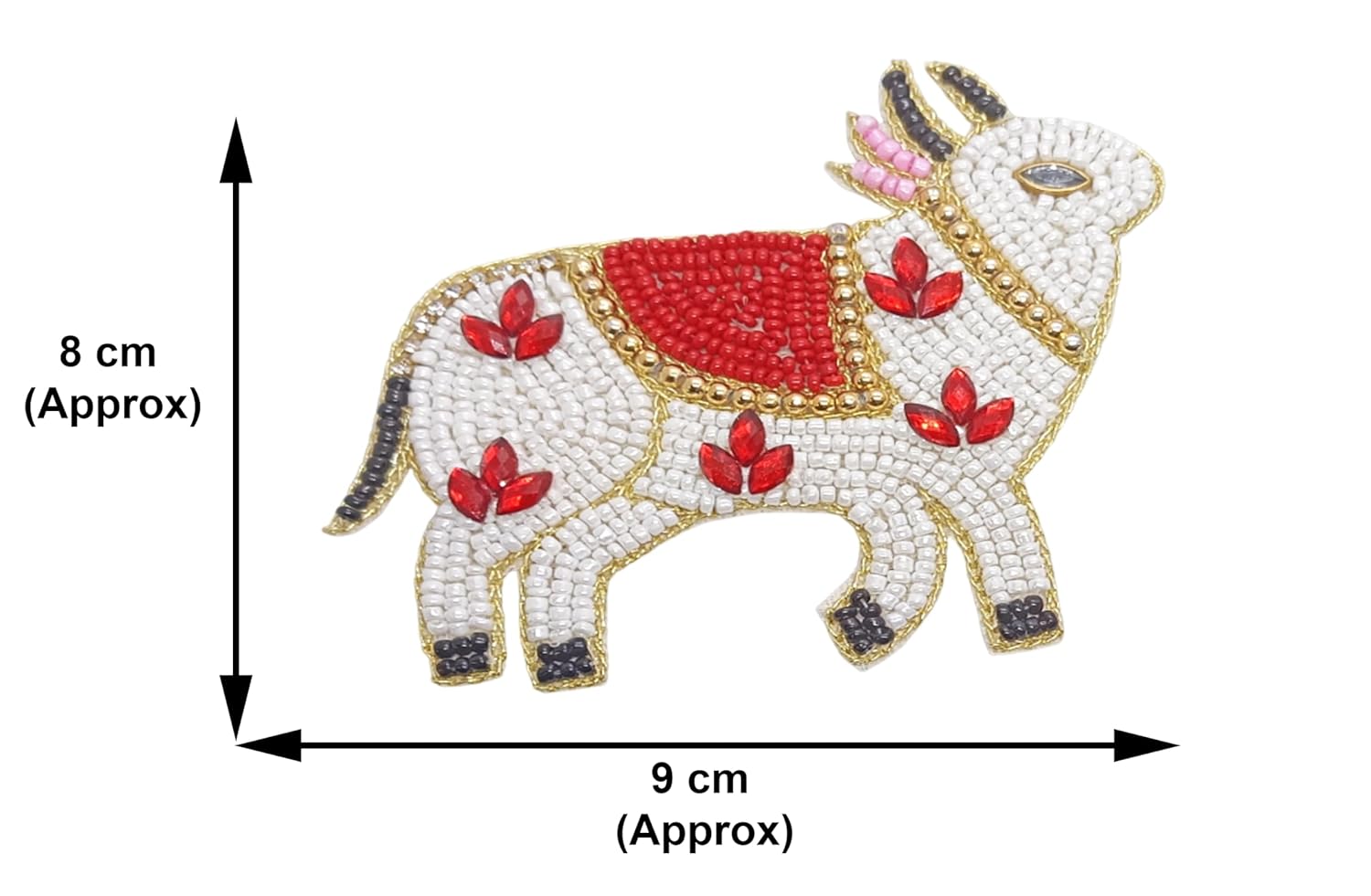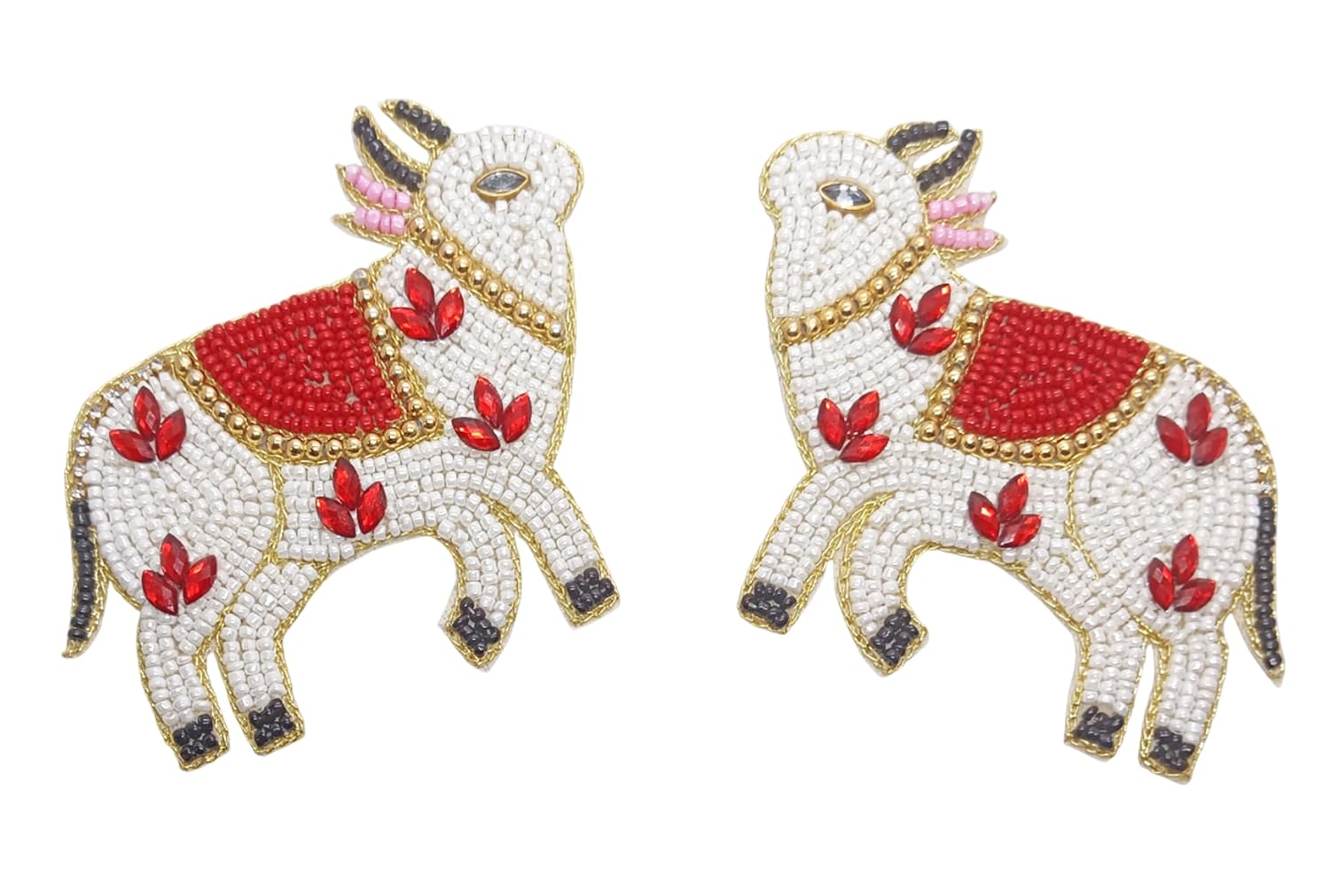 Transform your crafting projects with these exquisite handmade beaded cow applique patches. Each set includes a pair of mirror-image patches, meticulously crafted with pristine white beads, vibrant red saddle details, and elegant turquoise leaf accents. The intricate design features golden trim outlining, pink-beaded ear details, and black bead accents on the hooves and ears. Measuring approximately 8 cm x 9 cm, these patches are perfect for embellishing clothing, bags, cushion covers, or any fabric craft project. The detailed beadwork creates a charming three-dimensional effect that adds depth and visual interest to your creations. These versatile decorative elements can be used to add a touch of traditional Indian artistry to modern fashion pieces or home décor items. Each patch is carefully constructed to ensure durability while maintaining its ornate appearance. Ideal for creative enthusiasts looking to add unique, handcrafted elements to their projects. Return Policy